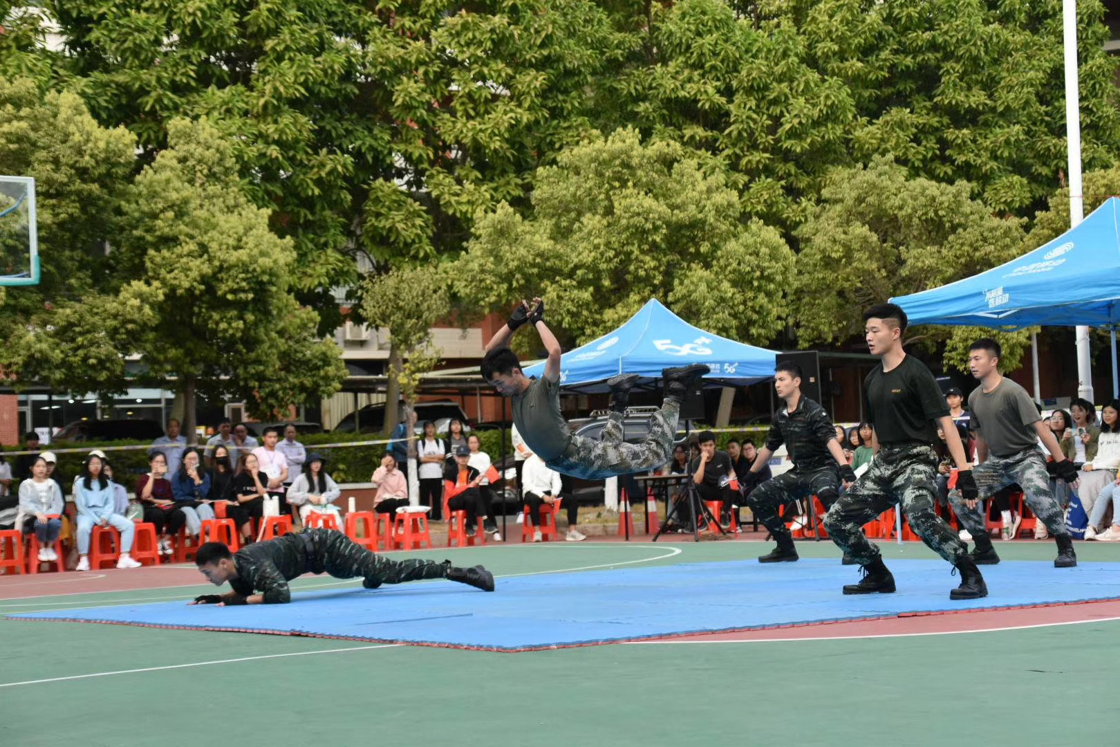 竞赛期间还穿插了由国防教育志愿服务中心提供的三个表演节目,将比赛现场的氛围推向了高潮。《女子匕首操》表演英姿飒爽,巾帼不让须眉的气势赢得了现场的阵阵掌声;《红旗飘飘》歌曲演唱娓娓动听,现场观众挥舞着手中的国旗,仿佛置身于红色的海洋;《刺杀与擒敌术》表演激情四射,各种刺杀和格斗战术彰显了男儿的军营热血。