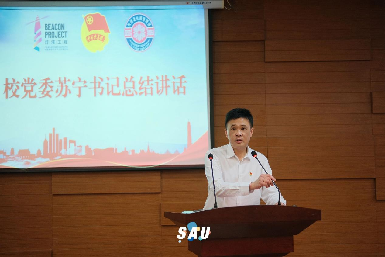 学校党委苏宁书记进行总结讲话。苏书记强调,学生社团是开展学生思想政治教育的重要载体和繁荣校园文化的重要平台。学生社团工作关乎大局稳定和学校事业发展,一直以来,学校党委高度重视学生社团工作,把学生社团管理纳入学校党建工作布局之中。他向各指导老师和各位同学们提出三点希望:第一,坚持政治方向,突出“引领力”。学生社团管理要旗帜鲜明地讲政治,要深入学习宣传贯彻党的二十大精神,发挥思想政治教育阵地作用。第二,坚持品牌导向,提升“吸引力”。打造精品学生社团,促进学生社团焕发新气象,展现新作为。第三,坚持严抓管理,增强“战斗力”。要清晰定位、开展具体指导,凝聚学生社团建设和管理的合力,加强对学生社团的管理和风险防范。