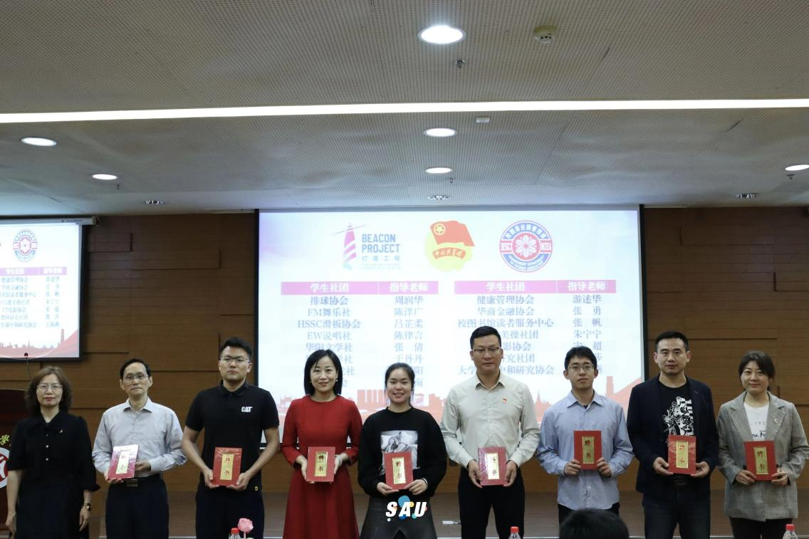(党委委员、党委办公室吕书勉主任为学生社团指导老师代表颁发聘书)