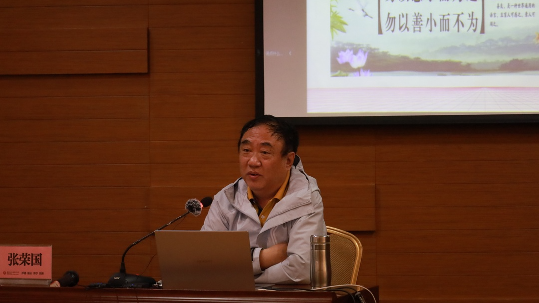 4月8日,张荣国教授以《高等学校教师职业道德修养》这一主题,向新入职教师展开专题培训第一讲。张荣国教授讲课幽默风趣,紧密切合实际。针对各位老师的情况讲解了教师职业道德的内化养成,从道德品质的养成、个体高尚人格的塑造、道德行为的选择这三个方面。