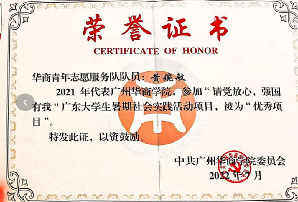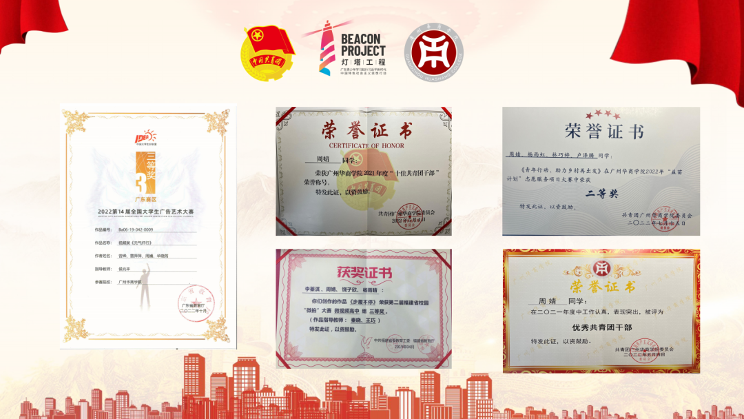 坚持不懈,收获硕果累累。周婧同学积极参加校内外多项竞赛,锻炼各方面能力素质。曾获福州外国语学校“优秀共青团员”、2022广东省大学生科技创新专项资金哲学社会科学调查报告与学术论文类立项项目、第十四届全国大学生广告艺术大赛三等奖、第十五届大学生科技学术季活动之广东大学生社会治理调研大赛三等奖、tyc7111cc太阳成“十佳共青团干部”、tyc7111cc太阳成“优秀生”一等奖学金等。