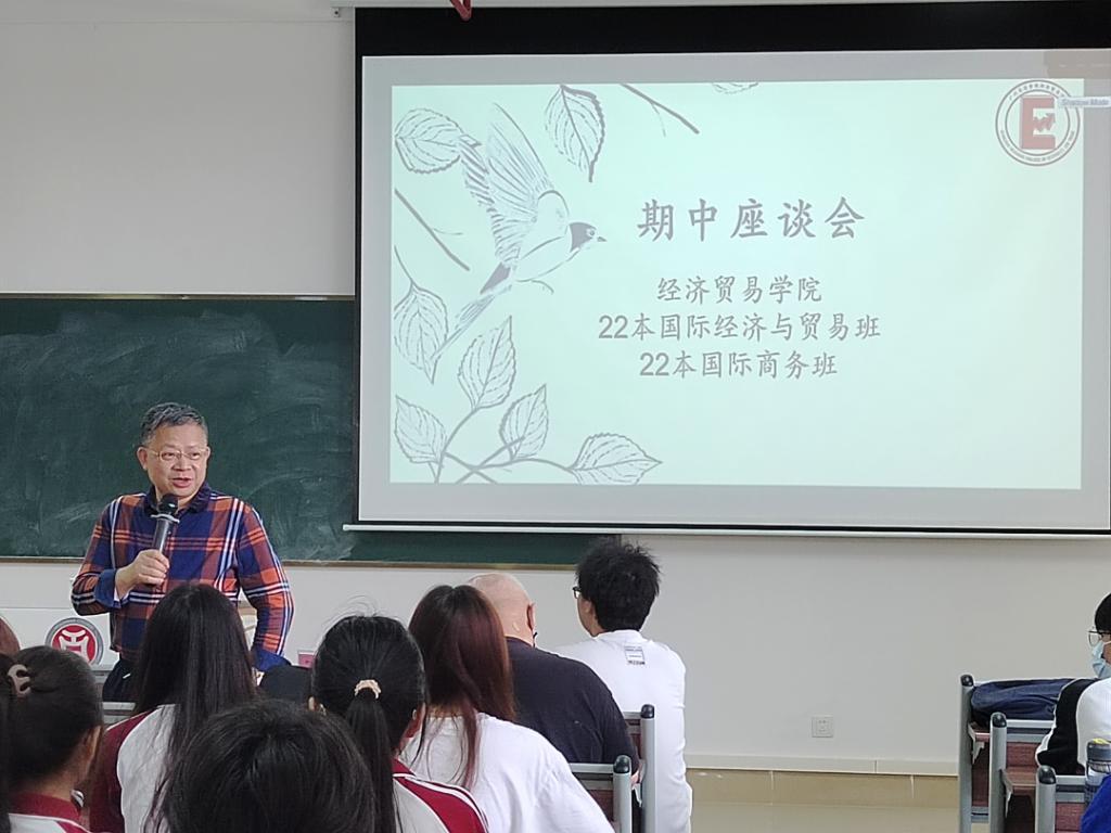 为深入开展学习贯彻习近平新时代中国特色社会主义思想主题教育,坚持立德树人初心,牢记为党育人、为国育才使命,促进经济贸易学院班风学风建设,深入了解四会校区经贸学子的学习情况与校园生活状态,经济贸易学院李广明院长率学院院长助理石立副教授、学工办主任宋元跃老师、各系负责人和教师代表于2023年5月9日前往四会校区,在22级国际经济与贸易班、跨境电商班、国际商务班、经济统计学班分别召开期中座谈会。