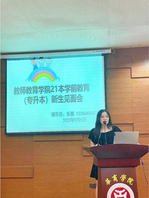 会议伊始,朱娜老师进行了自我介绍,对她的工作职责、时间及地点进行了详细的讲解,并介绍了教师教育学院2023年专升本新生情况。朱娜老师还向同学们介绍了八位助班的详细情况,并指出助班们将会帮助同学们更好的适应校园环境,营造良好的学习氛围。
