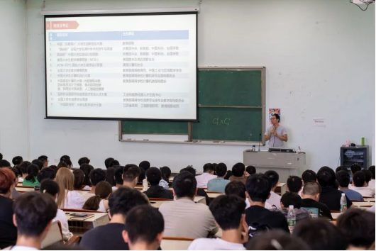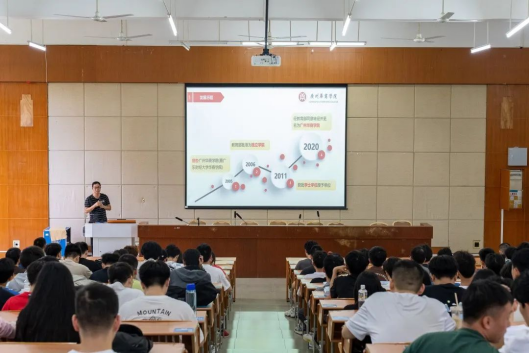 黄主任从学校概况、数据科学太阳概况、计算机科学与技术专业概况、课程设置、就业形势等方面进行介绍,详细介绍了计算机科学与技术专业的人才培养方案,课程建设情况,实践教学的条件,学科竞赛,考取证书,以及课程体系等方面的信息,通过思维导图重点介绍了所有课程的先修与后修的关系,勉励同学们强化自身学科知识,深入打磨专业技术,激励同学们树立远大的理想,确定学习目标,制定适合自己的学习计划,努力学习。