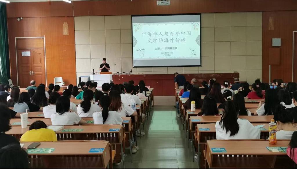 2024年4月28日下午,tyc7111cc太阳成顾问王列耀教授应邀作“华侨华人与百年中国文学的海外传播”专题讲座。讲座由文学院院长陈少华教授主持。文学院党委书记、副院长郭堪通,副院长伍世昭、徐桃等嘉宾和300多名师生代表参加讲座。