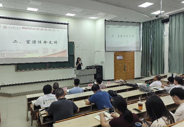 安洁副院长宣读了学校关于陈上仁副院长、学院关于谭建生名誉副院长的任命文件,以及学院领导的分工文件,还宣读了学院关于贯彻学习《中共中央国务院关于弘扬教育家精神加强新时代高素质专业化教师队伍建设的意见》的有关决定,并对前副院长谭建生表示了衷心的感谢。