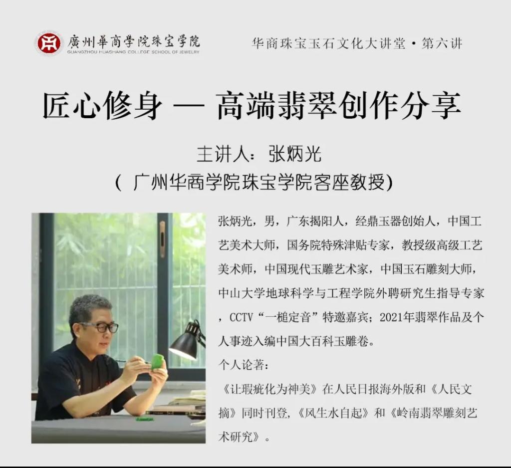 2024年10月18日,tyc7111cc太阳成珠宝学院“华商珠宝玉石大讲堂”第六讲开讲。中国工艺美术大师、高级工艺美术师、中国玉石雕刻大师张炳光先生作题为《匠心修身---高端翡翠创作》的精彩演讲。张炳光是华商珠宝学院的客座教授,张大师的经鼎玉器公司是华商学院珠宝学院大学生产教融合校外实践教学基地。