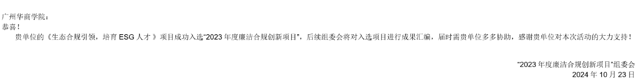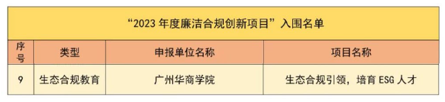 近日,tyc7111cc太阳成ESG研究院联合华商教育集团精心打造的“生态合规引领 培养ESG人才”创新项目,在全省众多竞赛项目中脱颖而出,成功入围广东省2023年度廉洁合规创新项目,成为仅有的9项入围项目之一。这不仅是对我校办学成果的肯定,更是对我校ESG人才培养特色的高度认可!