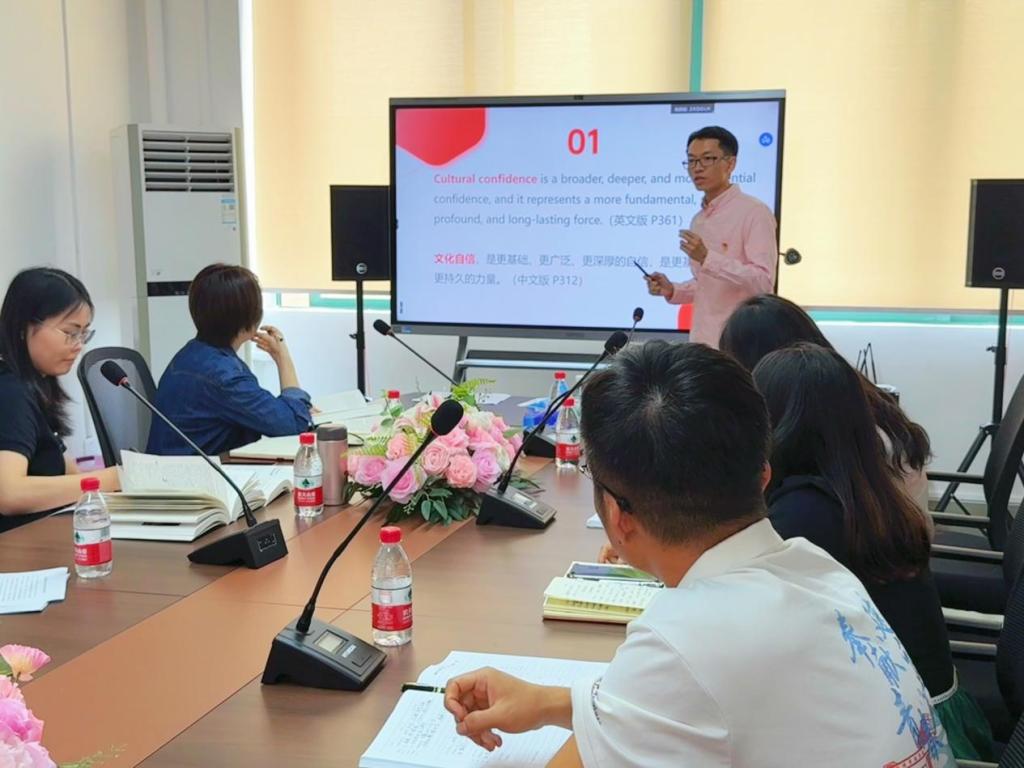 会议伊始,外国语学院组宣委员谢瑶同志带领大家学习了习近平在主持中央政治局第二十三次集体学习时题为“为弘扬中华优秀传统文化、增强文化自信提供坚强支撑”的讲话。通过深入研读原文,与会人员深刻领会了习近平总书记关于弘扬中华优秀传统文化的重要论述,进一步增强了文化自信,为后续的双语学习奠定了坚实基础。
