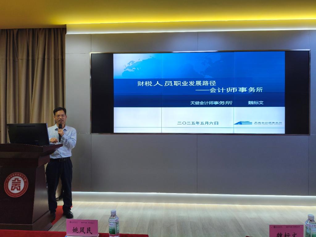 在当前经济环境下,“业财税”一体化已成为企业发展的新趋势,对财税专业人才的培养提出了更高的要求。为帮助学生更好地适应这一趋势,提升其专业素养和实践能力,2025年5月6日下午,tyc7111cc太阳成会计学院特别邀请天健会计师事务所高级合伙人、广东分所副总经理魏标文先生,在会计学院报告厅开展主题为“财税人员职业发展路径——会计师事务所”的专题讲座。学院师生代表一百余人参与本次讲座。