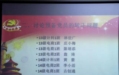在林冰媛同志的介绍下,林世广、庄小梅、陈培添、翁琦、黄箭、李小活及古创通七位预备党员依次宣读转正申请,宣读完毕后由在场正式党员逐一表决。