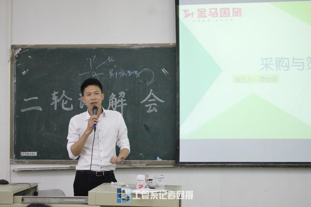 2017年5月11日19点,由工商管理系主办的第五届“金马杯”旅游线路策划大赛第二轮讲解会在励志楼B302圆满举行。本次讲解会分成比赛要求和规则讲解、复赛PPT评分讲解、专业老师讲解、金马国旅专业人员讲解以及提问环节五个流程。在主持人详细介绍了比赛要求和规则以及复赛PPT评分标准后,吴彬彬老师对参赛者们提出了复赛的相关建议;谭灿棠总监则从市场分析、线路考察与采购、产品组合、主题元素与焦点等方面为同学们带来精彩的讲解。在互动环节,金马旅行社谭总监和阎德峰副总经理热情解答参赛选手的种种疑惑。最后,在热烈的掌声下,本次讲解会圆满结束。
