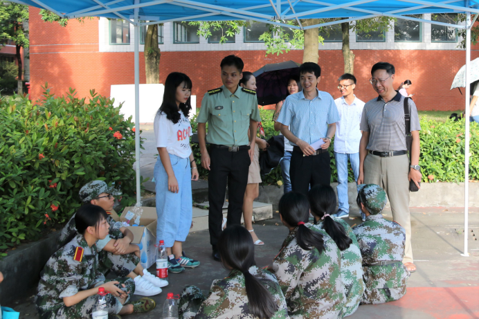 接着,我系主任一行走访了中央广场篮球场军训场地,详细地向教官了解了我系学生的军训情况,针对军训病患伤员情况,特别叮嘱做好学生工作,提前预测军训可能发生的紧急情况,切实保障同学的安全。同时对教官表达了敬意和感激。
