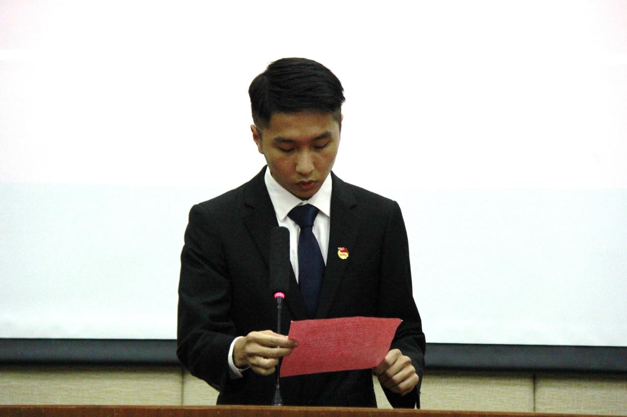 宣读誓词是本次大会的第五项议程。由学生会副主席兼记者团团长刘裕铭带领我们宣读誓词。举起右手,紧握拳头,用最响亮的声音喊出入团誓词。宣了誓,身上肩负的责任感便油然而生。