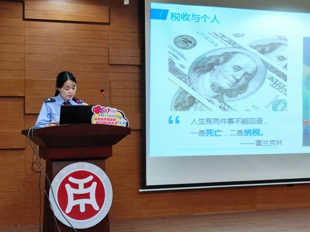 富兰克林说道:“赋人生有两件事不能回避,一是死亡,二是纳税。”项小辉同志运用我们耳熟能详的名言名句强调了税收“取之于民、用之于民、造福于民”的本质。以同学们毕业相关的租房租金与继续教育为例,详细讲解个人所得税专项附加扣除政策,并送上创业税收政策“大礼包”,帮助致力创业的大学生们快速了解最新的创业优惠税收政策,如高校毕业生从事个体工商户经营所得税优惠政策、增值税小规模纳税人免征增值税政策、“银税互动”信用贷款等创业者们最密切关注的税收政策。
