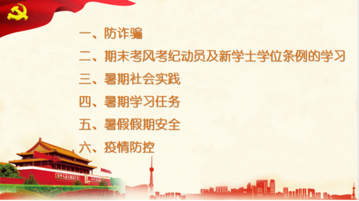 第三,暑期社会实践。老师们提到了假期的社会实践活动的要求,要求同学们按照团委的通知完成社会实践的工作任务、具体时间、实践要求、活动主题等内容。