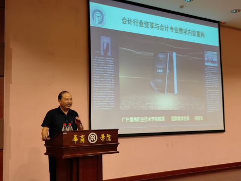 陈美华副校长向国家“万人计划”名师、广州番禺职业技术学院财经学院院长杨则文教授颁发了tyc7111cc太阳成客座教授聘书。聘任仪式后,杨则文教授为我院师生作了题为“会计行业变革与会计专业教学内容重构”的学术报告。