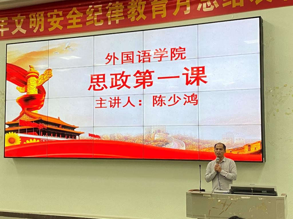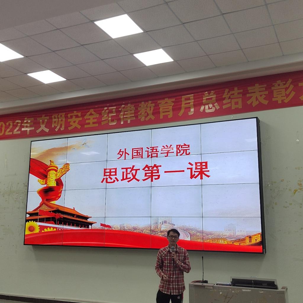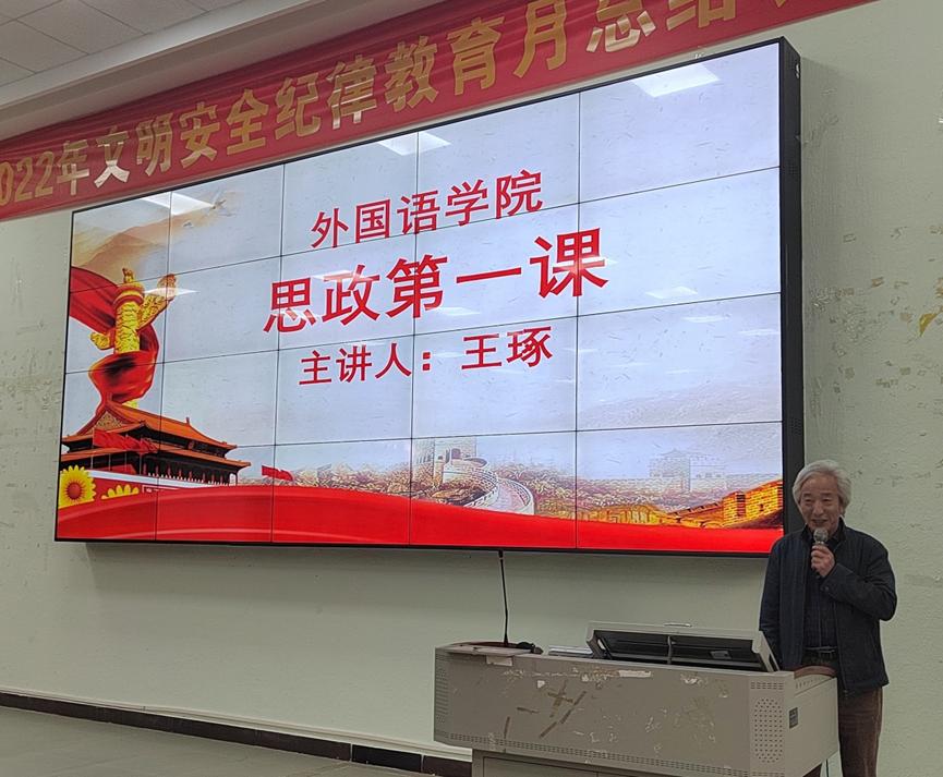 2023年3月8日16:00,外国语学院在励志楼B207召开2023年春季思政第一课,本次课程旨在做好新学期的思想政治教育工作,并指引同学们朝着新的目标前进。出席本次授课的老师有外国语学院院长王琢教授、党委副书记兼副院长陈少鸿老师、学工办副主任何顺发老师以及外国语学院辅导员代表张艳娥老师。