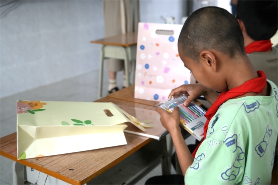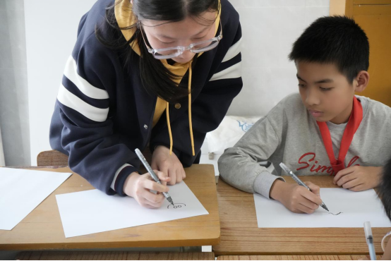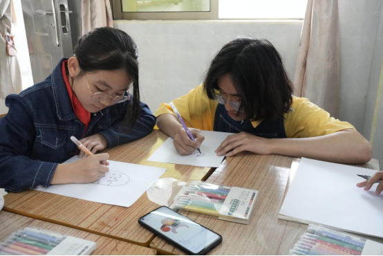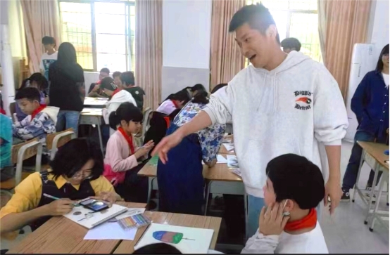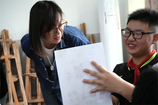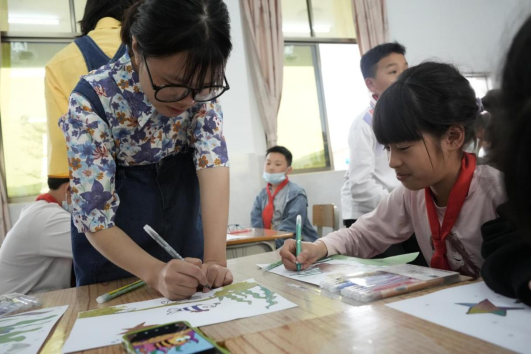 华商师生们与红军小学学生们进行绘画辅导和交流,积极地给予孩子们鼓励与引导。