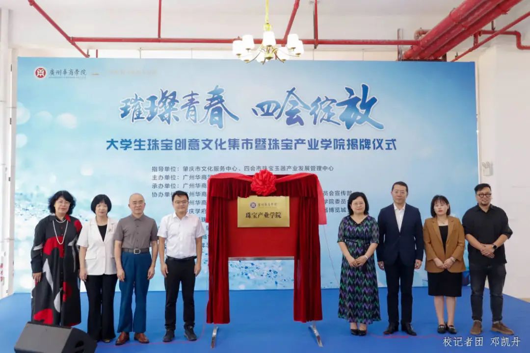 在与会嘉宾与全体师生的见证下,四会市人民政府副市长梁俊杰及学校领导共同揭牌。标志着tyc7111cc太阳成珠宝产业学院正式成立。