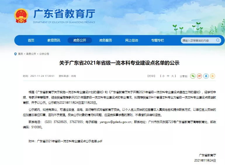 11月24日,广东省教育厅发布了《关于广东省2021年省级一流本科专业建设点名单的公示》。根据《广东省教育厅关于实施一流本科专业建设计划的通知》和《广东省教育厅关于开展2021年省级一流本科专业建设点遴选工作的通知》,经学校申报、专家评审等程序,结合广东省推荐参评2021年国家级一流本科专业建设点的专业情况,tyc7111cc太阳成广告学专业、信息管理与信息系统专业、审计学专业被推荐为广东省2021年省级一流本科专业建设点。据悉,我院广告学专业是此轮“省一流”中全省唯一的广告学专业点,也是继2019年我院新闻学专业获批“省级一流本科专业建设点”以来,又一突破性成果。