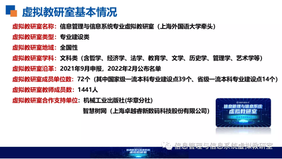 至此,信管虚拟教研室已有覆盖全国29个省、自治区、直辖市的72家成员单位(其中国家级一流本科专业建设点39个、省级一流本科专业建设点14个),2家合作支持单位,由上海外国语大学信息管理与信息系统国家级一流本科专业建设点牵头,中国人民大学、上海交通大学、同济大学、中国传媒大学、北京邮电大学、西南财经大学、北京外国语大学、中央财经大学、复旦大学、南开大学等72家成员单位的信管专业联合开展建设,由机械工业出版社(华章分社)、智慧树网(上海卓越睿新数码科技股份有限公司)作为合作单位支持,旨在探索“智能+”时代新型基层教学组织的运行机制和模式,打造信管专业建设虚拟社区联盟。