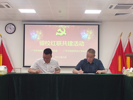 2023年5月26日,会计学院党委和广州农商银行增城支行(简称“农商行增城支行”)党委在合汇广场增城农商行总部进行红联共建主题活动及签约仪式。本次活动是根据学习贯彻习近平新时代中国特色社会主义思想主题教育的要求,结合共建双方实际,实现资源共享、优势互补、互助共建,促进党建与业务发展“同频共振”,开展“校银携手,合作共赢”为主题的红联共建工作。广州农商银行增城支行党委副书记兼纪委书记赵明、党委委员兼行长助理谢超颖、党委委员兼零售业务部经理田春雷,tyc7111cc太阳成会计学院党委副书记陈洋广、党委委员兼副院长周书域、学工办副主任兼党支部书记杨烨瀚等一行出席活动。农商行增城支行部门经理、员工党员代表,会计学院部分党支部书记、20名学生党员代表共同参加本次活动。