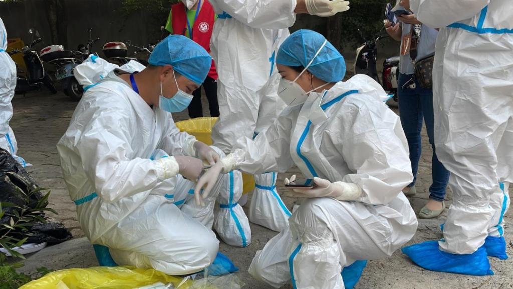 初次进入封控核心区,恐惧与害怕迎面而来。门上到处贴着封条,道路上空无一人,只有穿着防护服的“大白”。邹佳康和“大白”一起挨家挨户做核酸,进行拍摄。